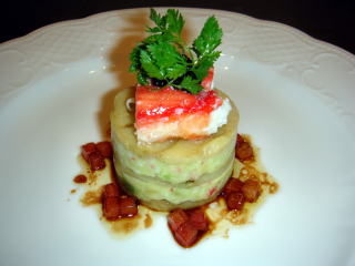 「サザエのエスカルゴ」は、和と洋の組み合わせ。写真のオードブルには茄子がはさまっていて、柔らかい食感を楽しむ。そしていつものようにフォアグラのテリーヌと貴腐ワインがサーヴされ、メインの魚と肉へ。ヒラスズキは白身魚とソースとの組み合わせが絶妙で印象に残った。